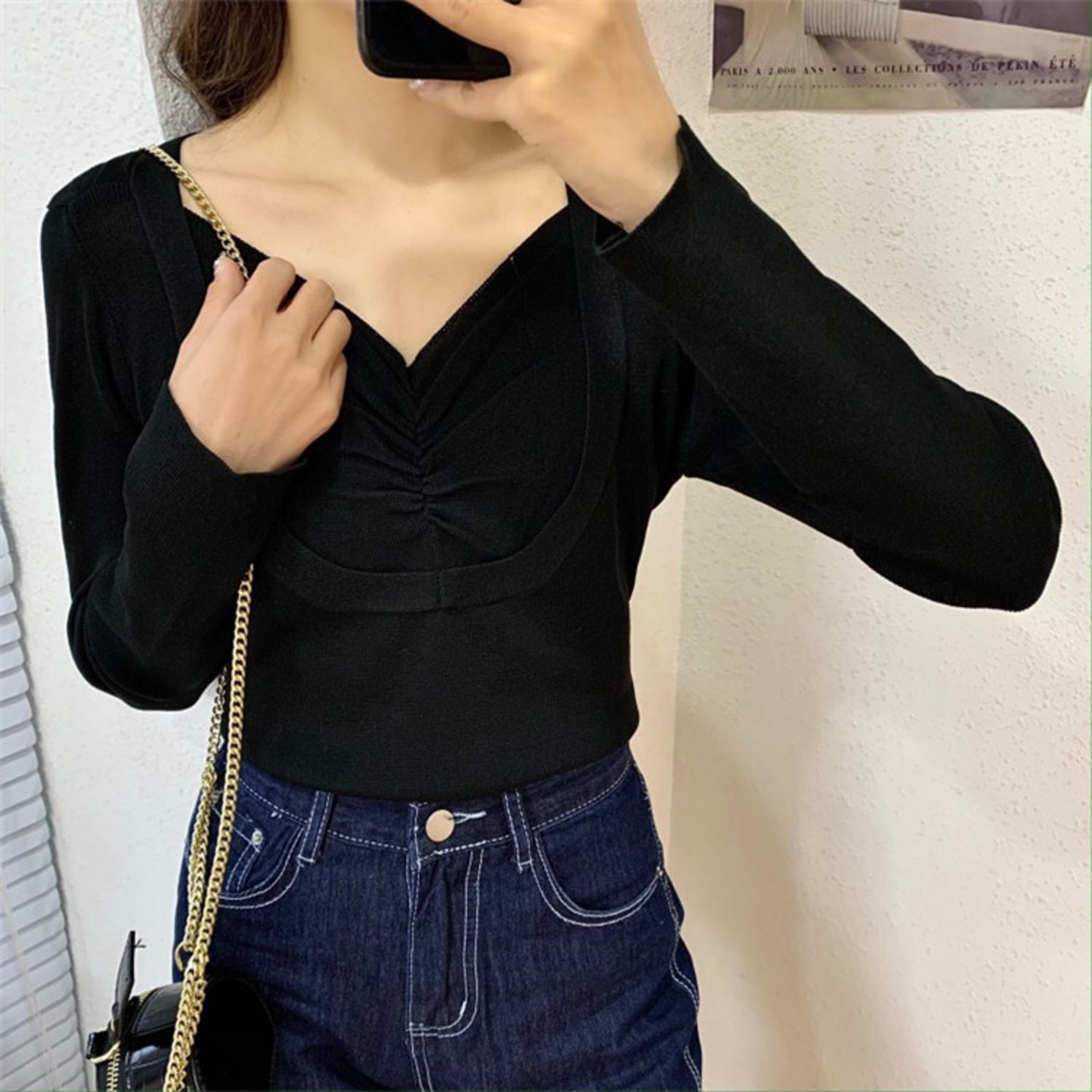 レディース スリムフィット 短いスタイル デザインセンス プリーツ スラウンドネック