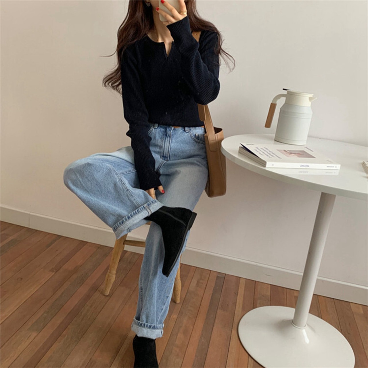 オリジナル Vネック スリム 長袖 ストレッチ ニットトップス 快適である