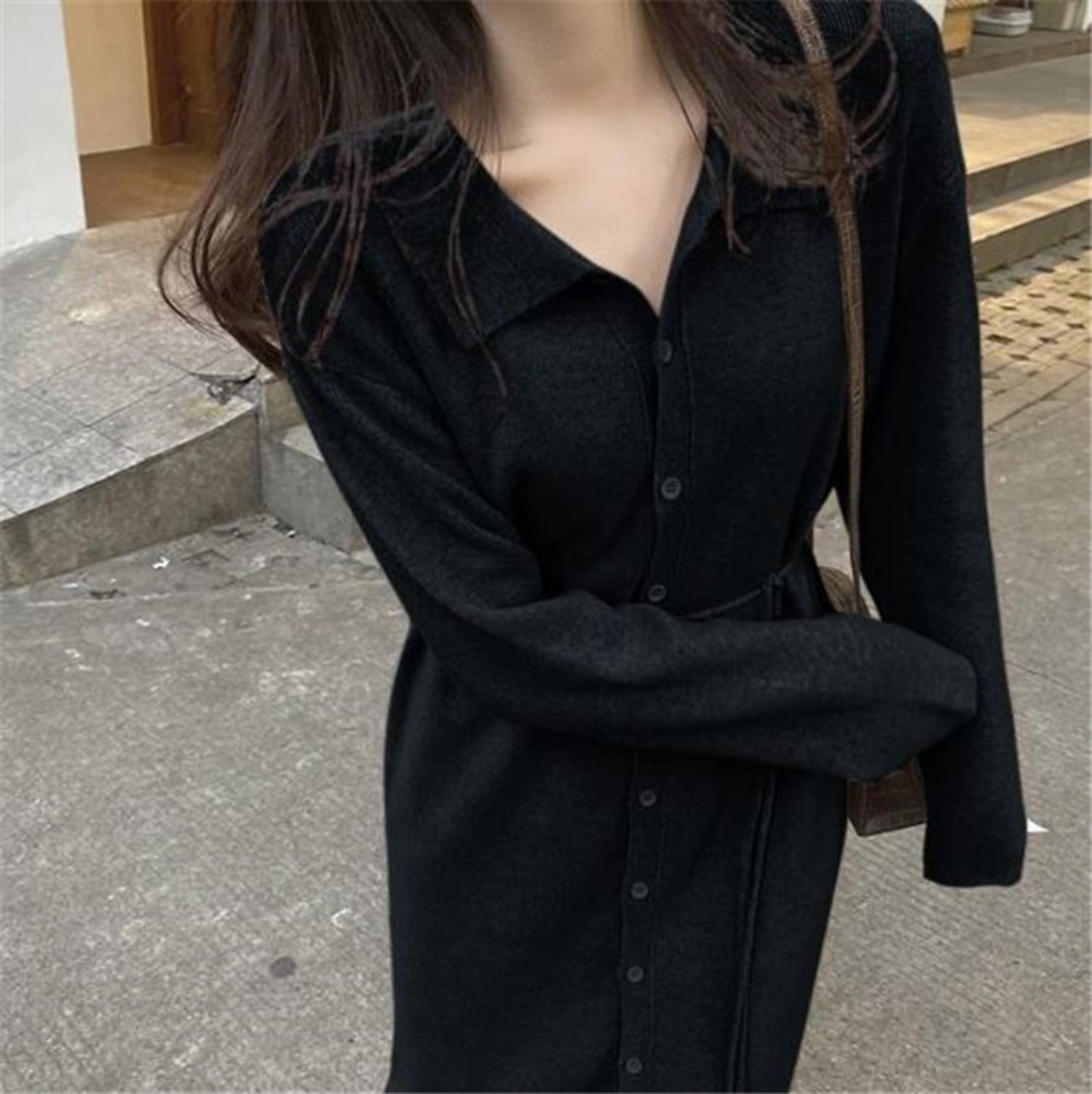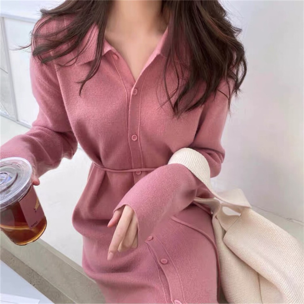 腰を括る ラペル ニット ピュアカラー ワンビース 長袖 ロングセクション ゆったりする