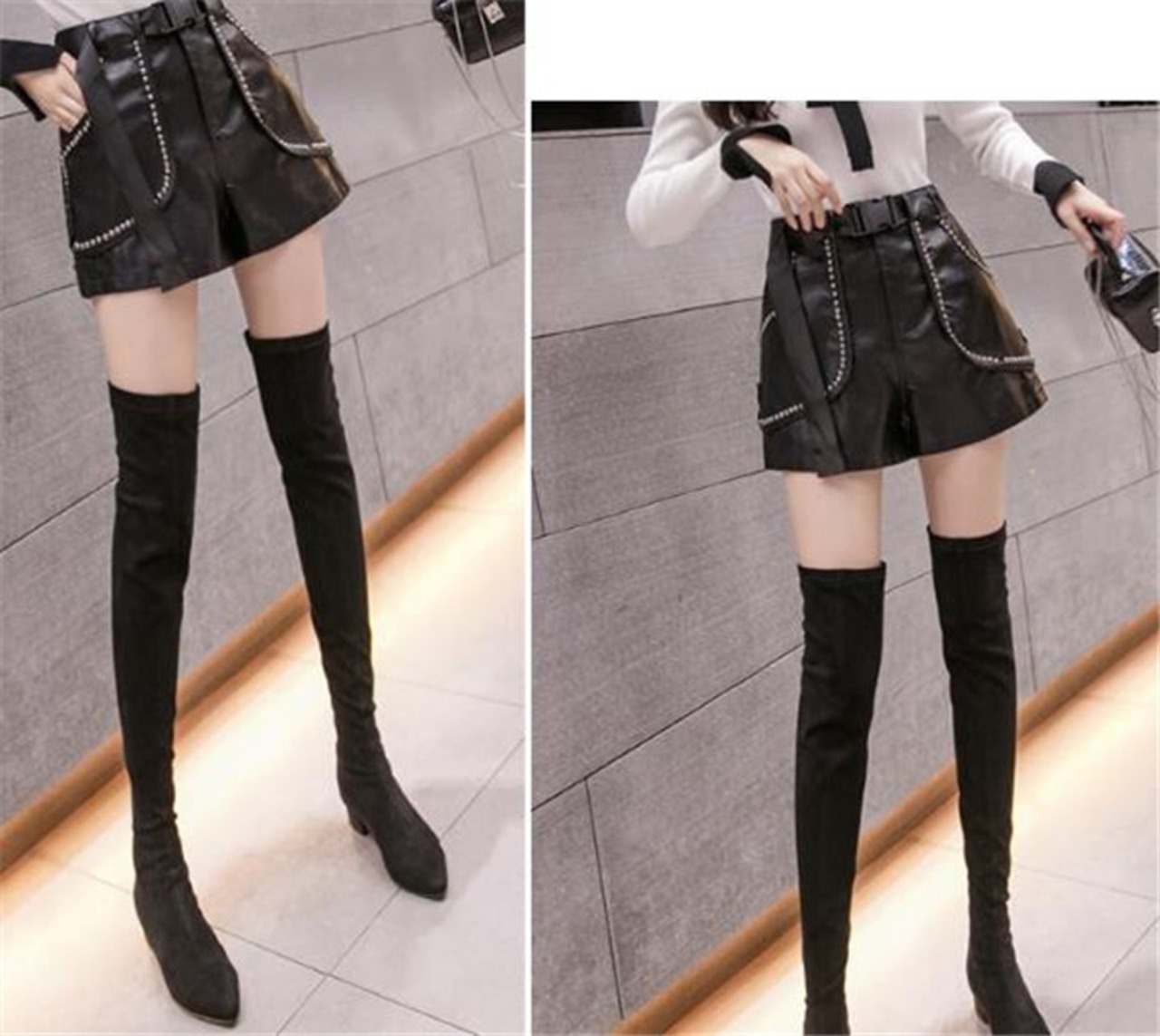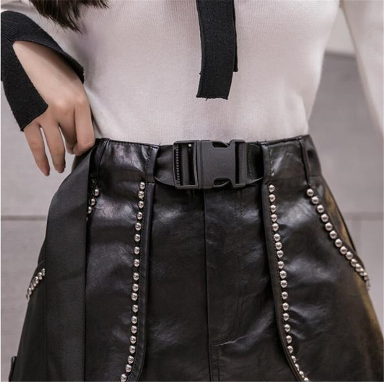 ハイウエストデザインで脚長効果があり、スリムなシルエットを演出。リベットやPUレザー素材でおしゃれ感が満載。