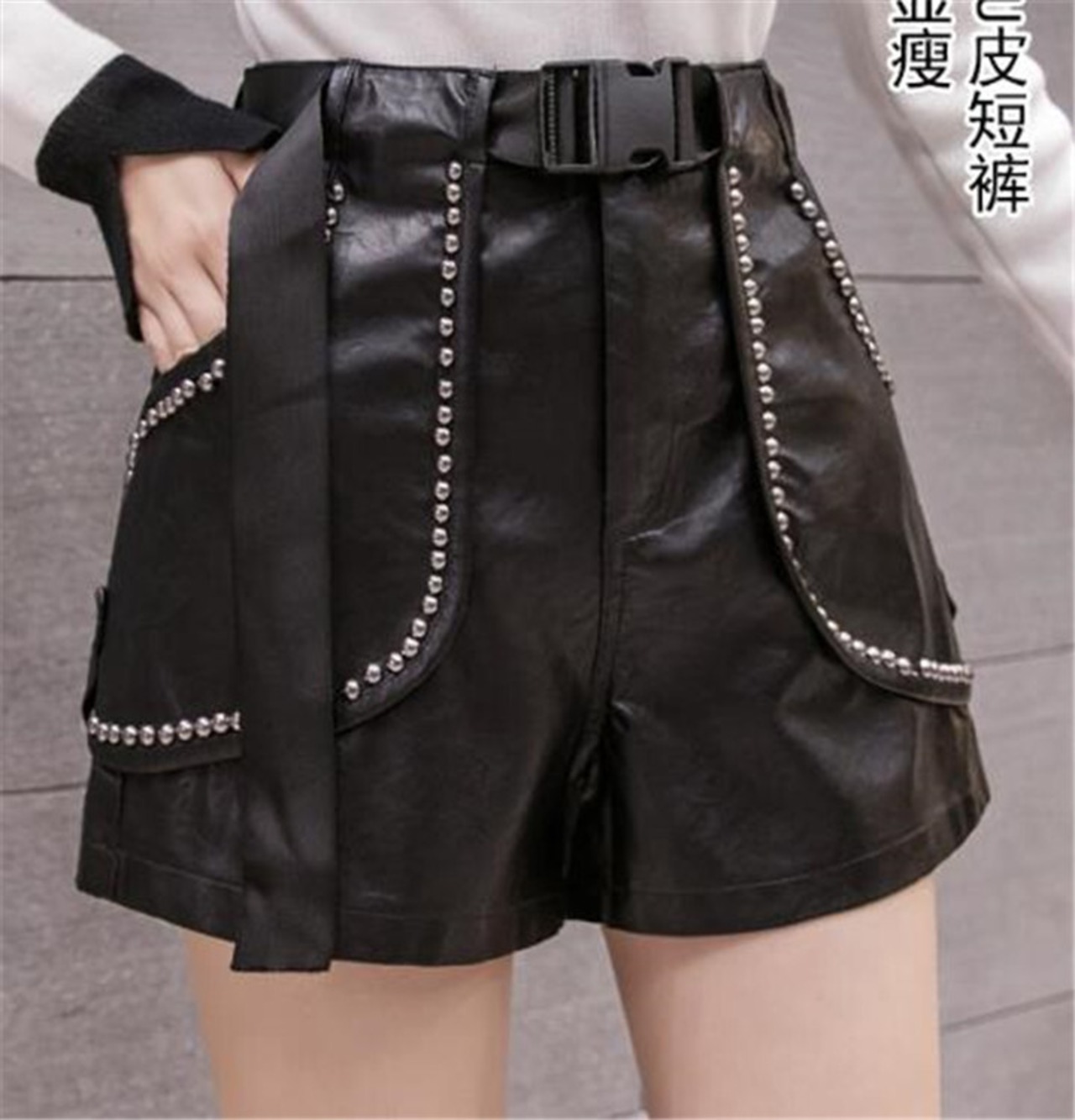 ハイウエスト リベット ワイドレッグ ホットパンツ PUレザー ショートパンツ ファッショナブル スリム
