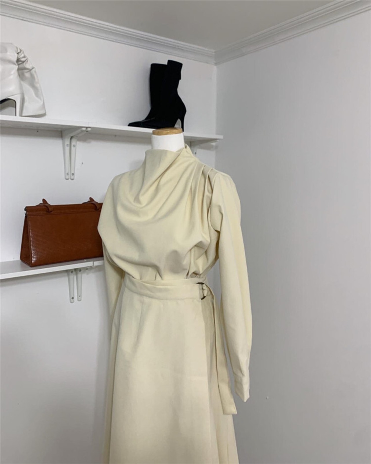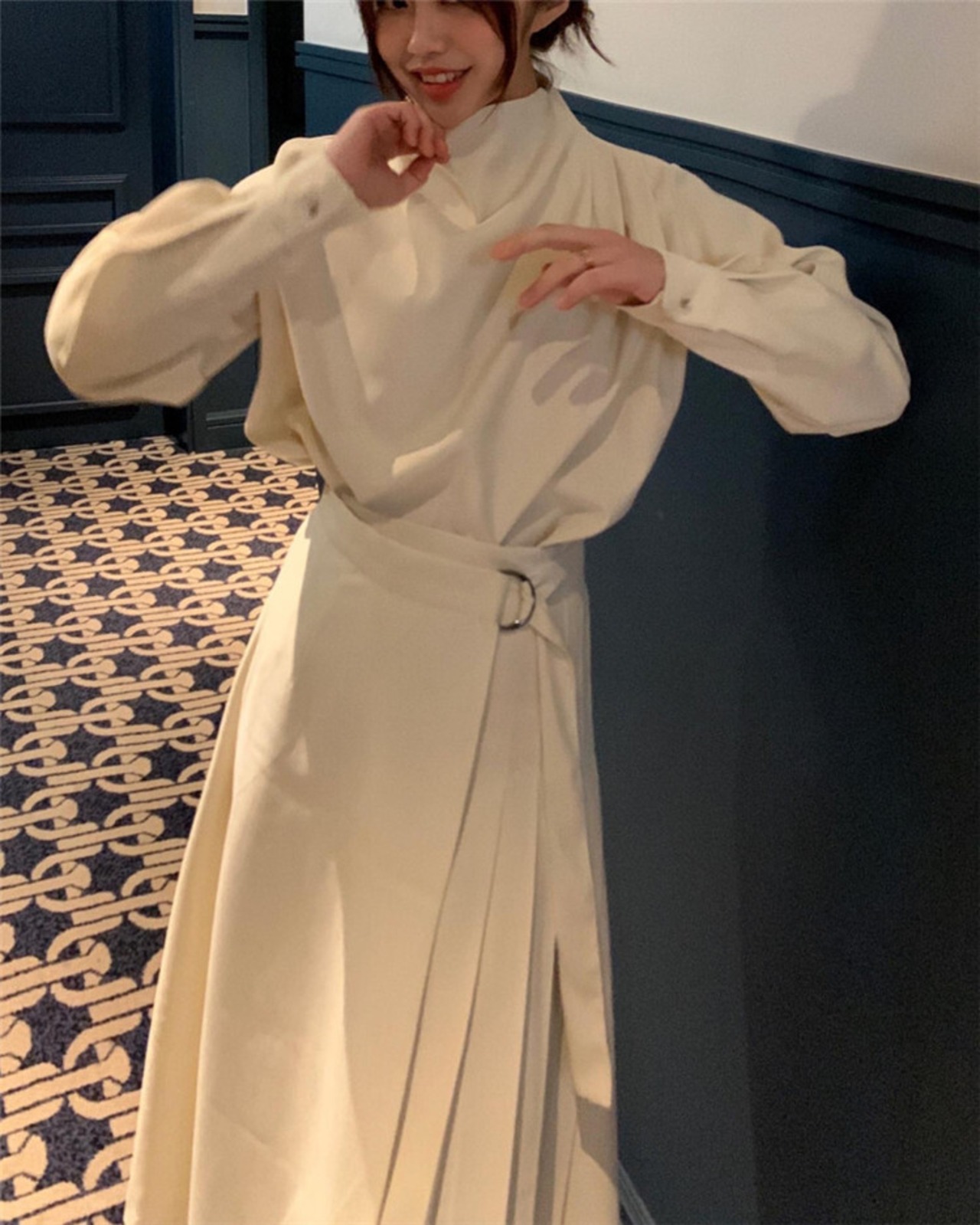 上品で洗練された印象を与えるトップスとスカートのセットが登場しました。ハイウエストのデザインがスタイルアップ効果を発揮し、スリムなシルエットを演出します。華やかなギャザリングがアクセントになり、デザインセンスの光る一着です。