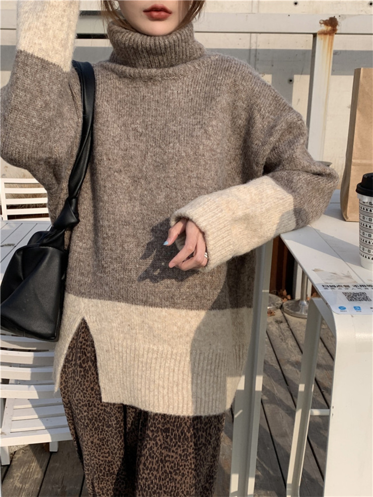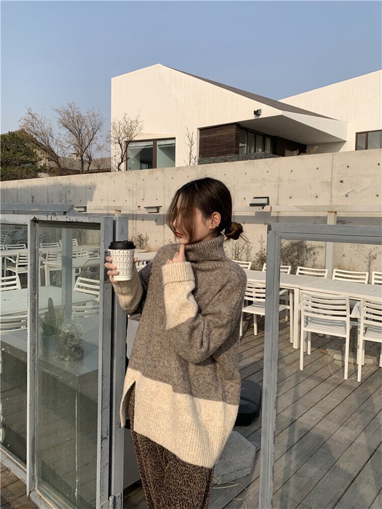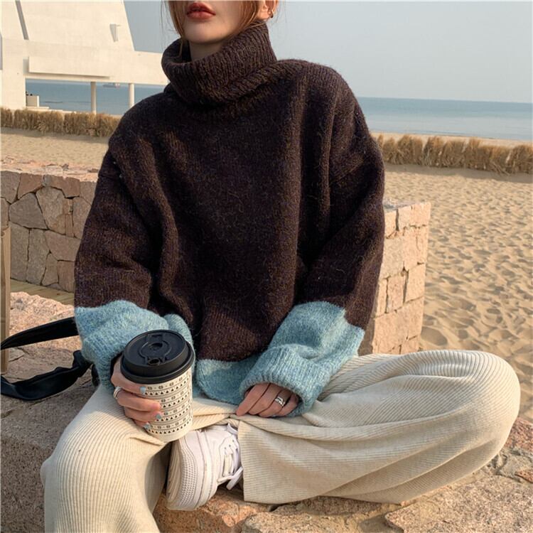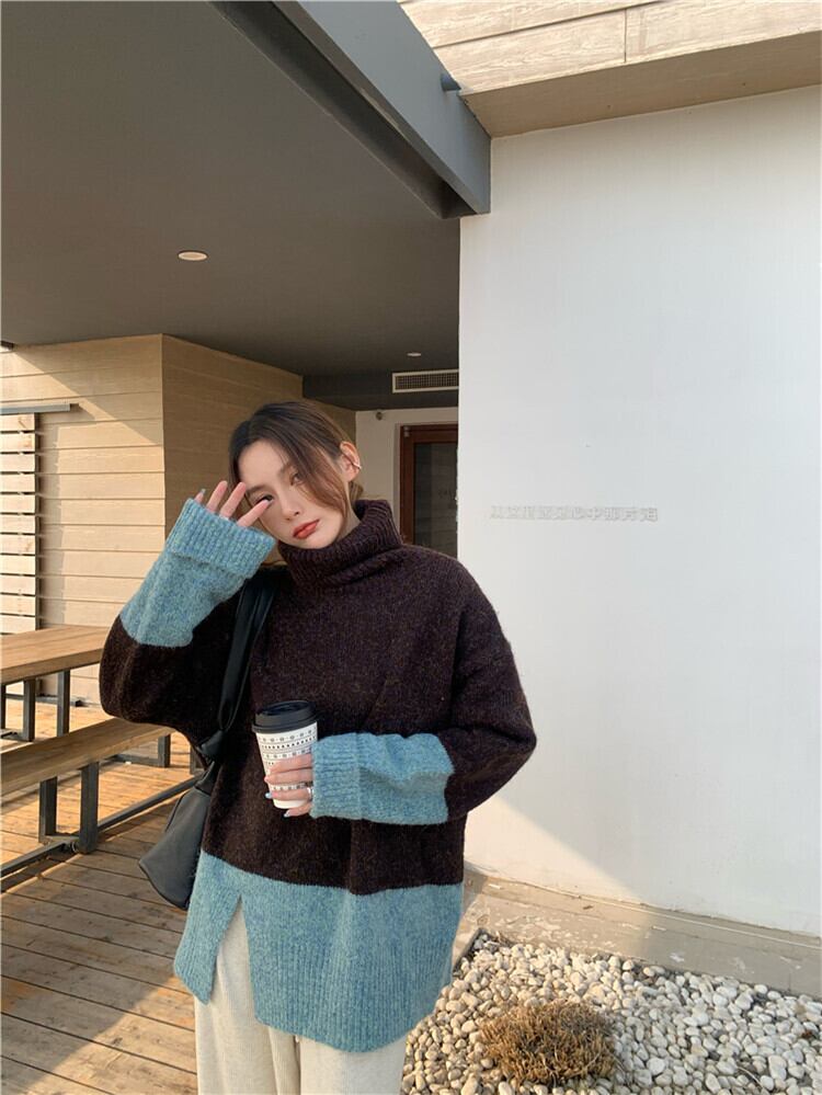 タートルネック セーター カラーマッチング 裾スリット 厚み 暖かい 百掛け ゆったりする カジュアル
