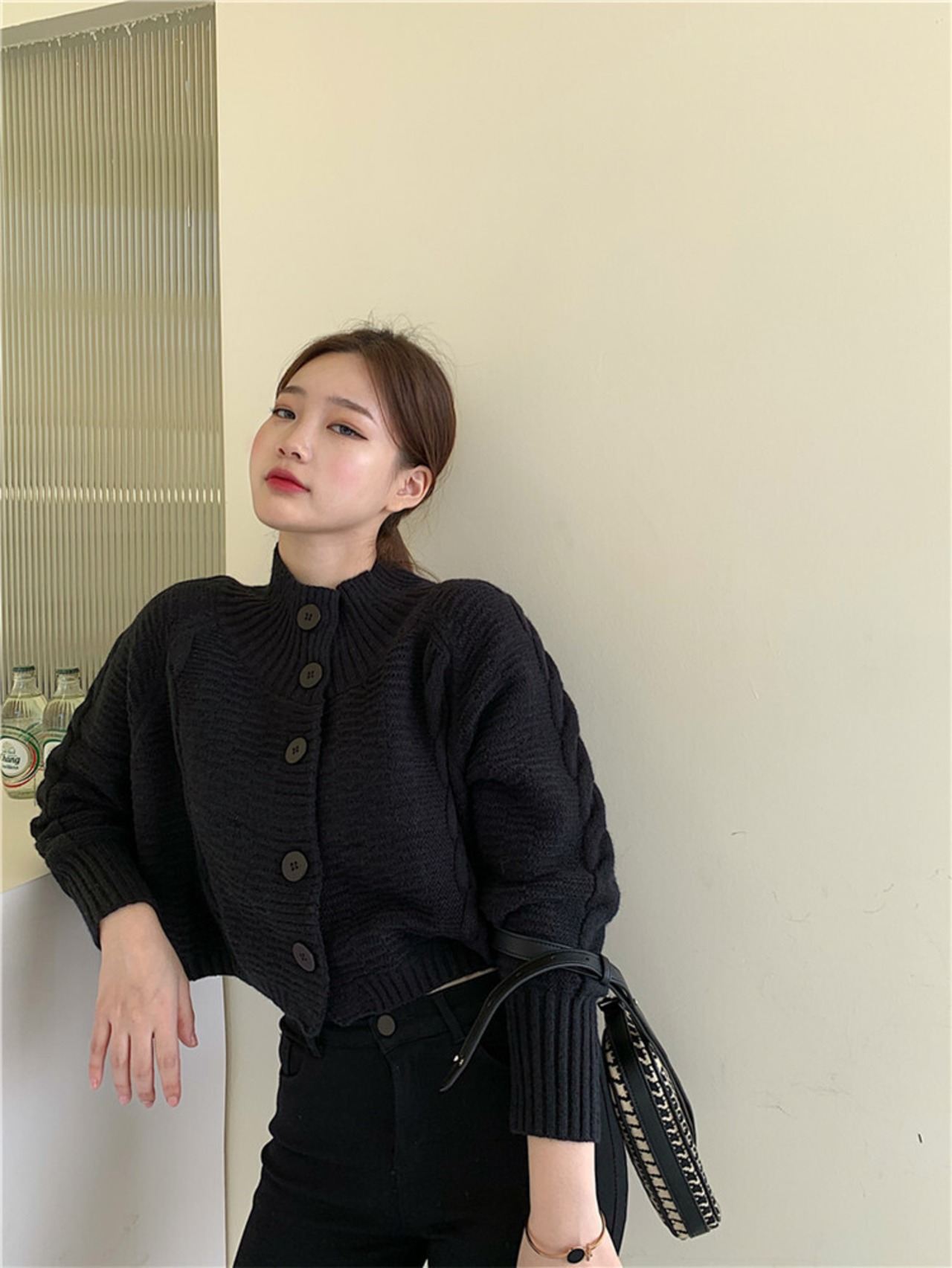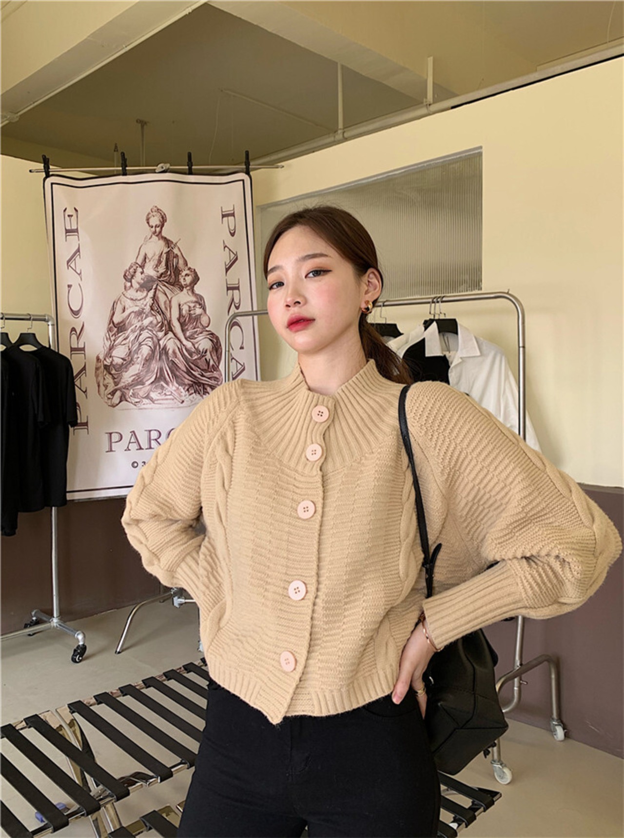 麻の花 単体ボタン ランタンスリーブ ニット カーディガン 厚手 短いスタイル レトロ ゆったりする 気質