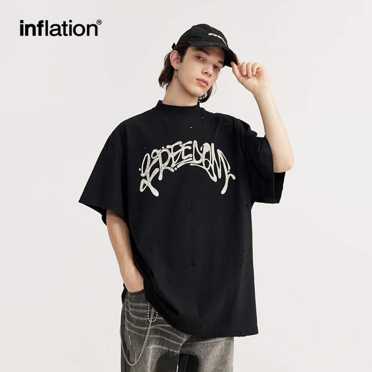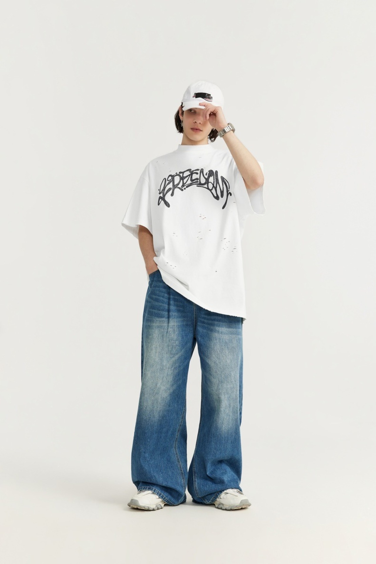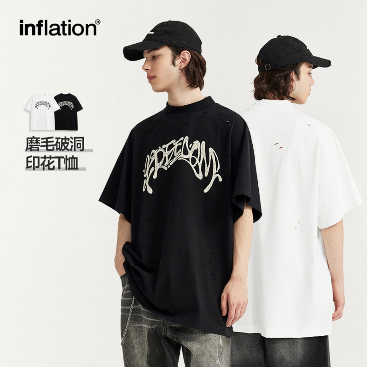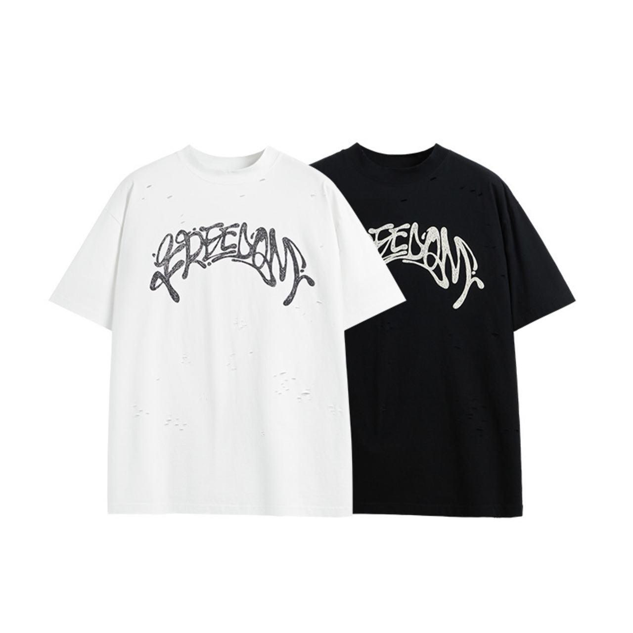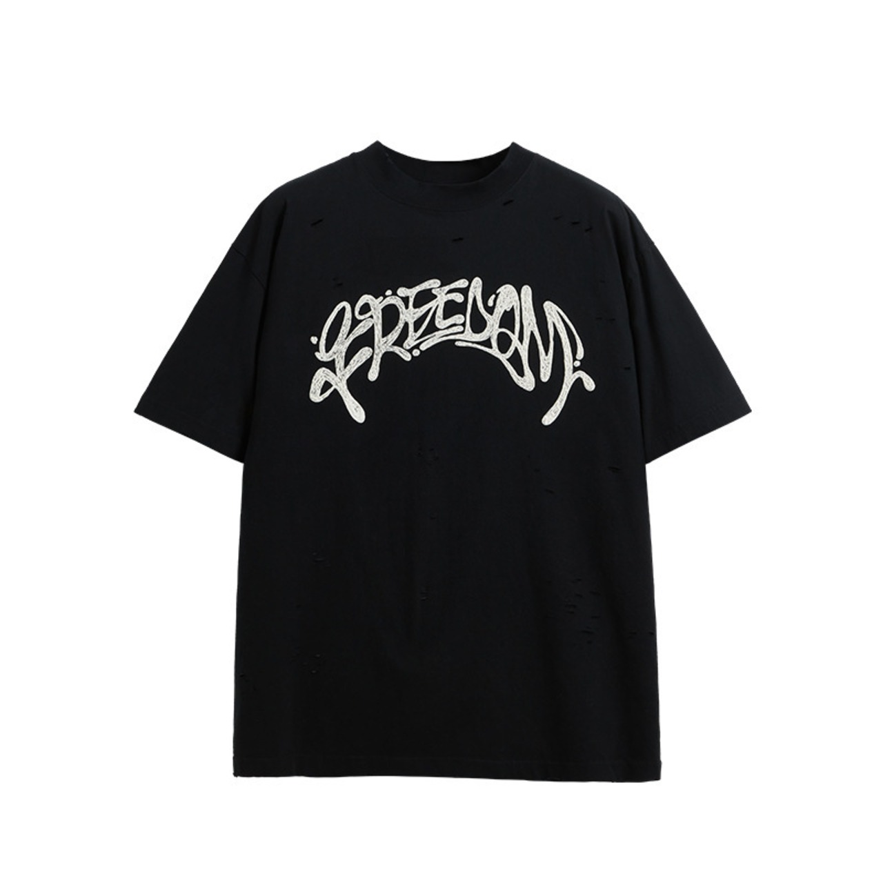 P17078メンズ ラウンドネック ダメージ トッブス Tシャツ 半袖 2024春夏新作 プリント