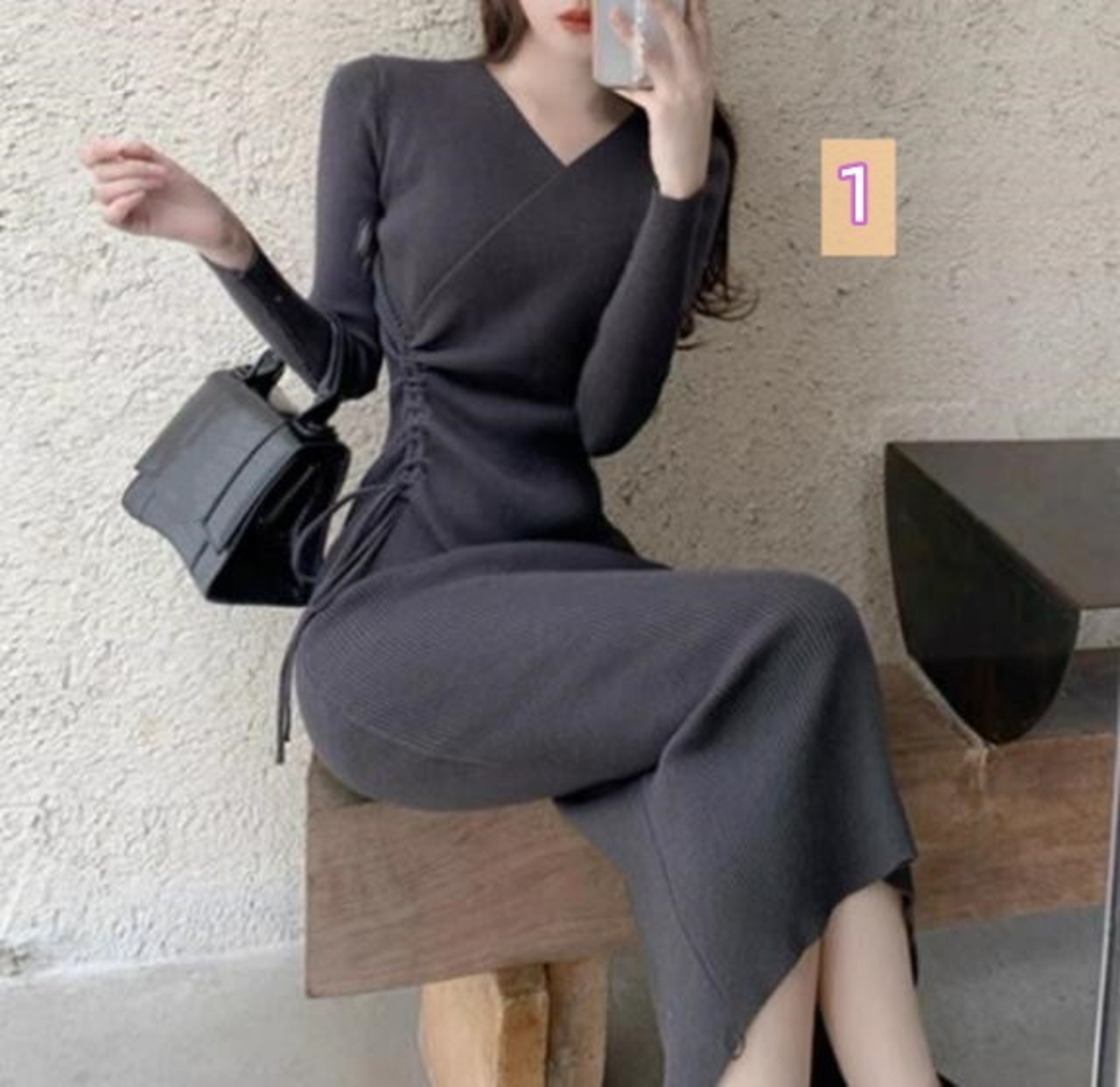 秋冬新作 女 レディース ハイウエスト 長袖 ニット セーター ロング ワンピース 台型スカート